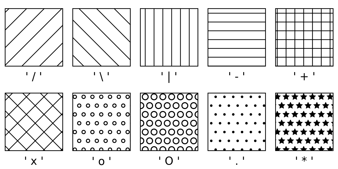 - 框内线型:可选'/', '\', '|', '-', '+', 'x', 'o', 'O', '.', '*',可组合重复