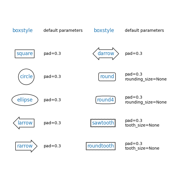 "square, pad=0.3" == BoxStyle.Square(pad=0.3) == BoxStyle("square", pad=0.3) == BoxStyle("square, pad=0.3")